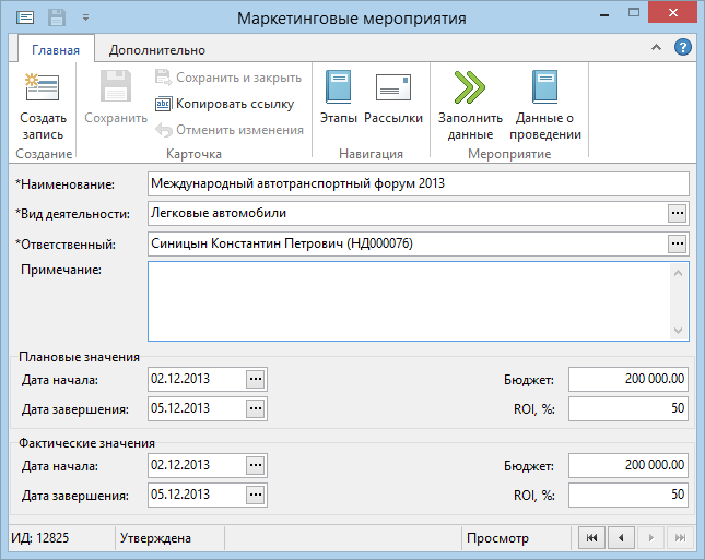 Все планируемые и проведенные маркетинговые мероприятия содержатся в справочнике Маркетинговые мероприятия. По каждому мероприятию фиксируются плановые и фактические даты проведения, определяются ресурсы, выделяются этапы проведения маркетингового мероприятия. В рамках каждого этапа или по мероприятию в целом создается список организаций-участников.