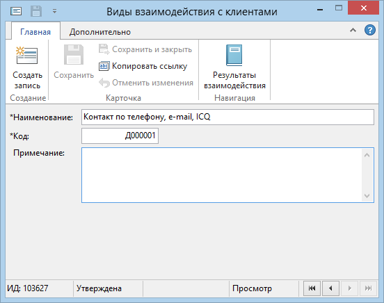 Справочник используется для учета информации о всех видах контактов с клиентами в рамках процесса продаж, маркетинговых мероприятий, а также при обслуживании клиентов.
