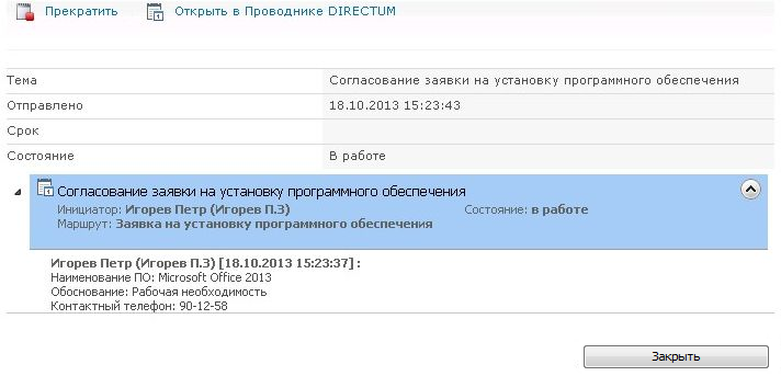 Кнопка Открыть в Проводнике DIRECTUM предназначена для открытия карточки задачи в проводнике системы DIRECTUM.