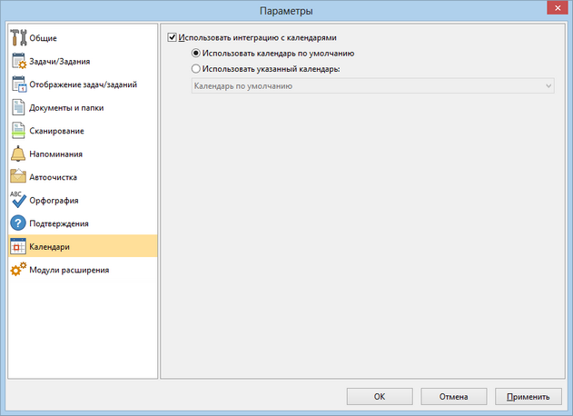 По умолчанию используется индивидуальная настройка интеграции с календарями, параметр Использовать интеграцию с календарями установлен.
