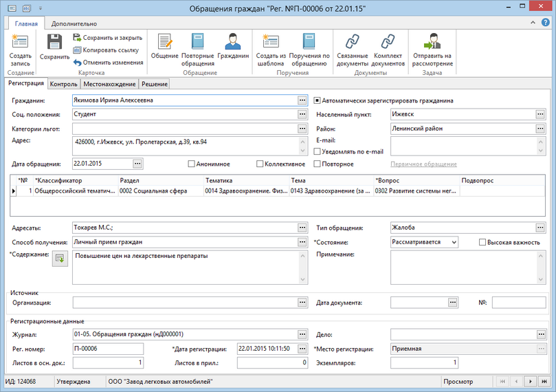 Закладка предназначена для указания данных обращения и регистрационных данных.