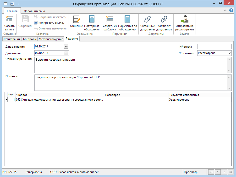Если по обращению создавались поручения, то после выполнения всех поручений обращение автоматически закрывается. Затем регистратор вносит результаты исполнения поручений на закладку «Решение» в карточке обращения.