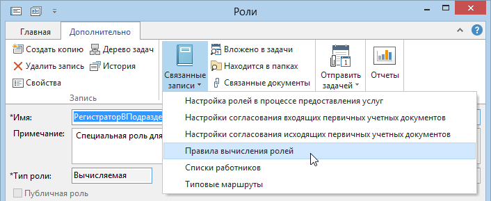 | 2. | На вкладке Дополнительно в выпадающем списке Связанные записи выберите пункт Правила вычисления ролей: |