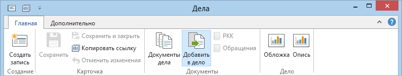 | 1. | В карточке дела нажмите на кнопку Добавить в дело: |