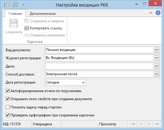для входящей и исходящей РКК: Способ доставки. При регистрации входящего или исходящего документа поле Способ доставки автоматически заполнится указанным значением.