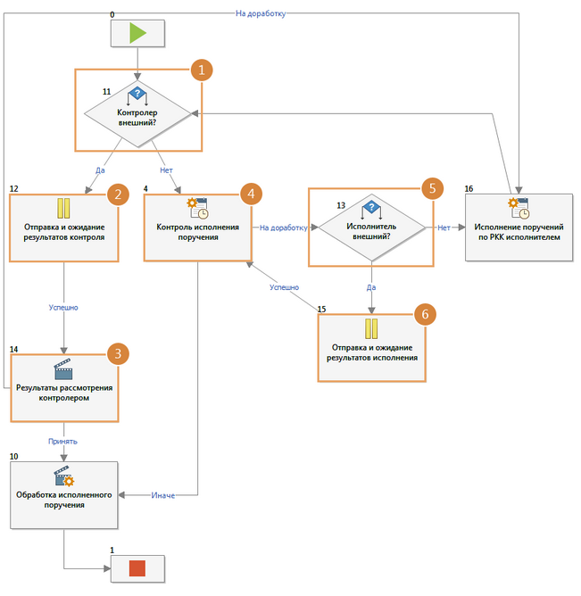 После того, как исполнитель выполнил работы по поручению, он прикладывает отчет об исполнении и выполняет свое задание. Контролеру отправляется подзадача по типовому маршруту Контроль исполнения поручения. Если в дальнейшем поручение отправляется на доработку, то работы ведутся в рамках этого типового маршрута.