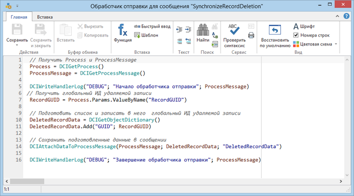 В системе-приемнике из переданных данных получается глобальный ИД записи. По глобальному ИД ищется запись справочника. Если запись найдена, то она удаляется:
