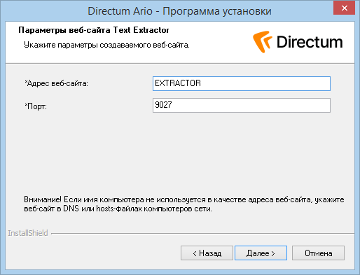 | • | в поле *Адрес веб-сайта укажите имя создаваемого веб-сайта сервиса Text Extractor Service. По умолчанию указывается имя компьютера, на который выполняется установка; |