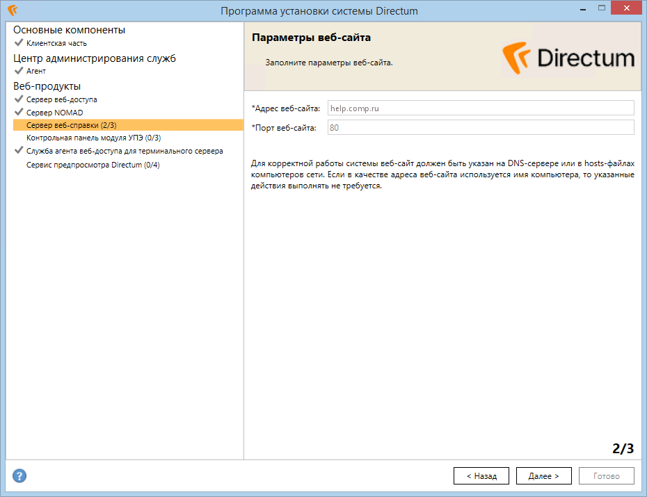 Если на текущем компьютере была установлена веб-справка предыдущей версии Directum, поле автоматически заполнится имеющимися значениями и станет недоступно для изменения;