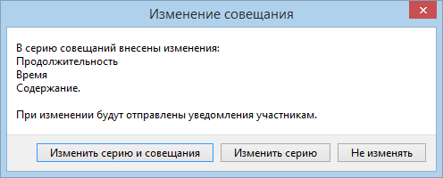 При сохранении изменений совещания или серии, которые не отправлялись на согласование, будет предложено отправить уведомления участникам. Все участники получат уведомления об изменениях, вне зависимости от критичности изменений.