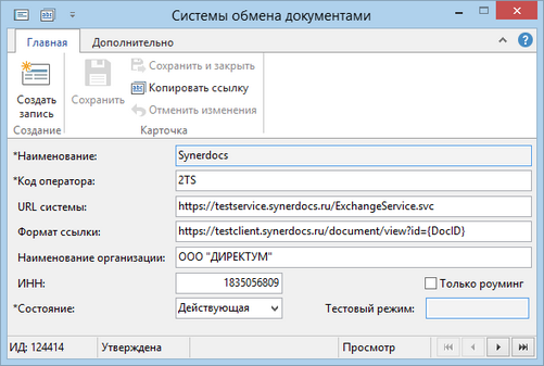| 1. | Откройте карточку справочника Системы обмена документами, с которой настроен обмен, и в поле Тестовый режим установите значение Да. |