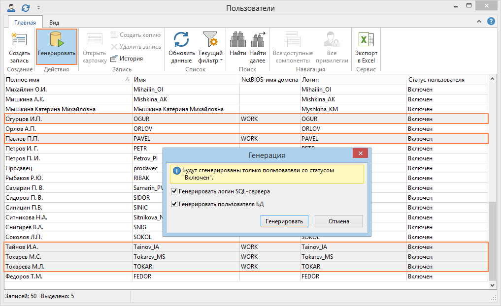 Генерация пользователя в компоненте Пользователи обеспечивает наличие таких записей, то есть обеспечивает доступ пользователя системы к данным на SQL-сервере.