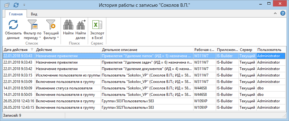 Для контроля назначения прав доступа на компоненты и объекты системы существует возможность просматривать историю изменений записей компонент Пользователи, Группы пользователей, Компоненты и Привилегии. Для этого воспользуйтесь одним из способов: