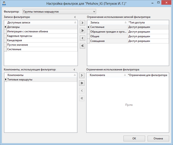 Для настройки ограничения по некоторой записи, ее нужно переместить в табличную часть «Ограничения использования записей фильтратора» и указать нужный тип доступа. Для отчетов фильтр настраивается прямым перечислением записей и типа доступа к ним. Для справочников фильтр настраивается косвенно – не через перечисление доступных записей справочников, а через перечисление доступных записей-фильтраторов для этих справочников. Например, справочник Группы типовых маршрутов является фильтратором для справочника Типовые маршруты. В приведенном примере (см. рисунок) в справочнике Типовые маршруты будут доступны следующие группы типовых маршрутов: