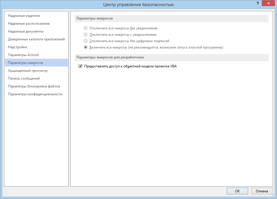 | 4. | На вкладке Параметры макросов установите переключатель Включить все макросы (не рекомендуется, возможен запуск опасной программы) и флажок Предоставлять доступ к объектной модели проектов VBA: |