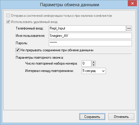 Не прерывать соединение при обмене данными. Если флажок установлен, то обмен данными будет производиться в рамках одного удаленного соединения. Если флажок не установлен, то удаленное соединение будет устанавливаться каждый раз по мере необходимости. Установка удаленного соединения занимает определенное время, и во время установленного удаленного соединения телефонная линия будет занята;