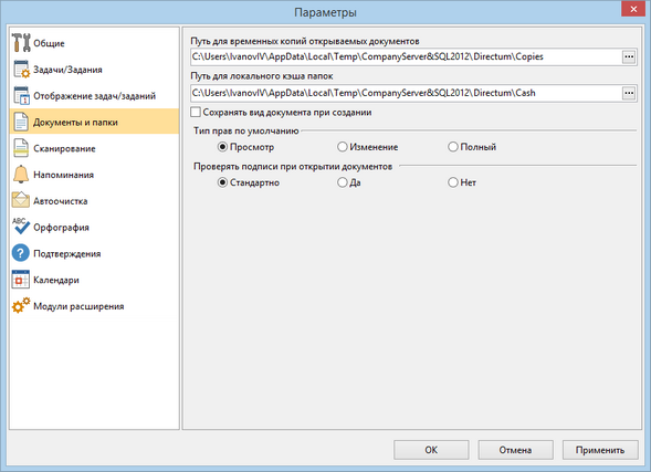Путь для временных копий открываемых документов. Папка на локальном диске, в которую при работе пользователя будут автоматически сохраняться временные копии редактируемых им документов. Пользователь должен иметь полные права на эту папку.