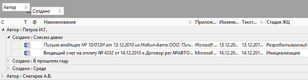 Например, при группировке списка документов по колонкам Автор и Создано список будет иметь вид: