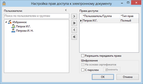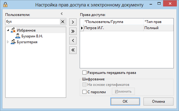 Найденных пользователей или группы можно добавить в таблицу «Права доступа». Подробнее см. раздел «Настройка прав доступа к объектам системы».