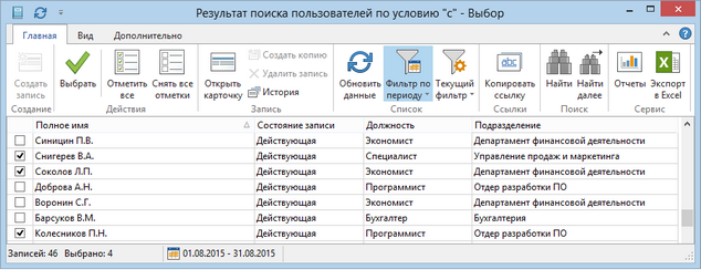 Выбранные записи можно сортировать и фильтровать по колонке с флажками. Следует учитывать, что при установке фильтра флажки для уже выбранных записей не снимаются.