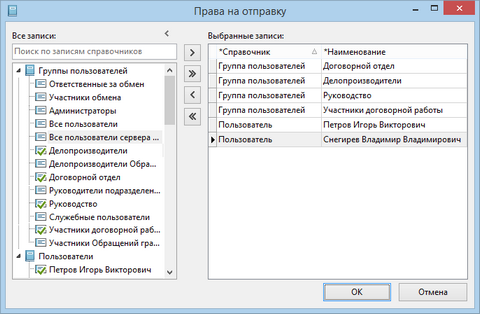 Если в таблицу «Выбранные записи» требуется добавить все результаты поиска, найденные для определенного справочника, выделите этот справочник в дереве «Все записи» и нажмите на клавишу Enter или на кнопку