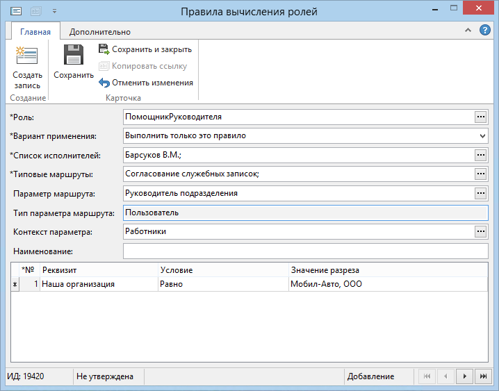 *Роль. Запись справочника Роли, для которой настраивается правило. Доступны только роли с типом Вычисляемая.