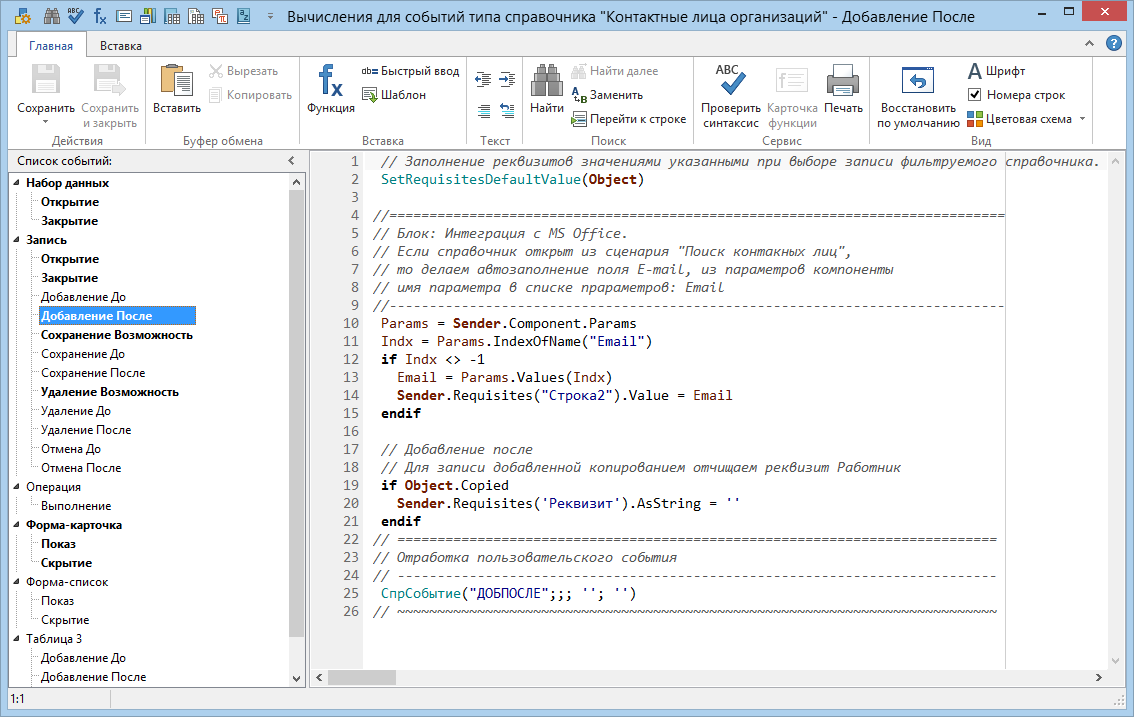 Редактор событий предназначен для программной обработки событий типа справочника.