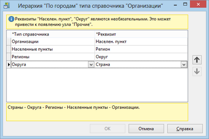 Схема иерархии задается списком пар Тип справочника – Реквизит. Можно использовать только сохраняемые реквизиты раздела «Карточка» типа «Справочник».