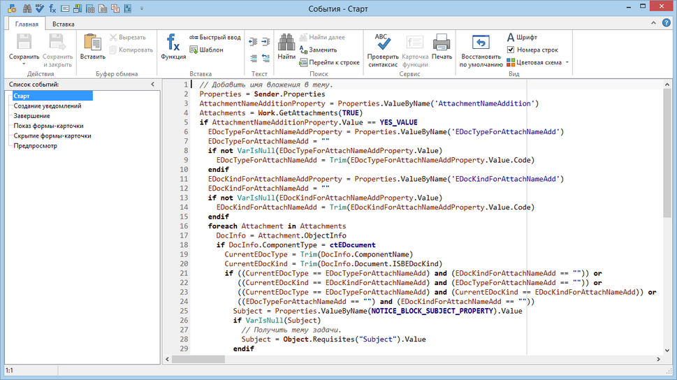 Удалять или добавлять события нельзя. При выборе события отображается текст его программной обработки в правой части окна. События, для которых настроена программная обработка, выделены жирным шрифтом. Подробнее см. раздел «Редактор вычислений».