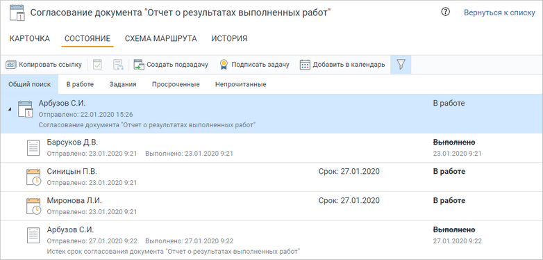 Состояние определяет, какие действия можно выполнить в карточке задачи или задания. Например, выполнить задание можно, только если задание находится в состоянии «В работе», а принять работы по задаче, только если задача находится в состоянии «На контроле».